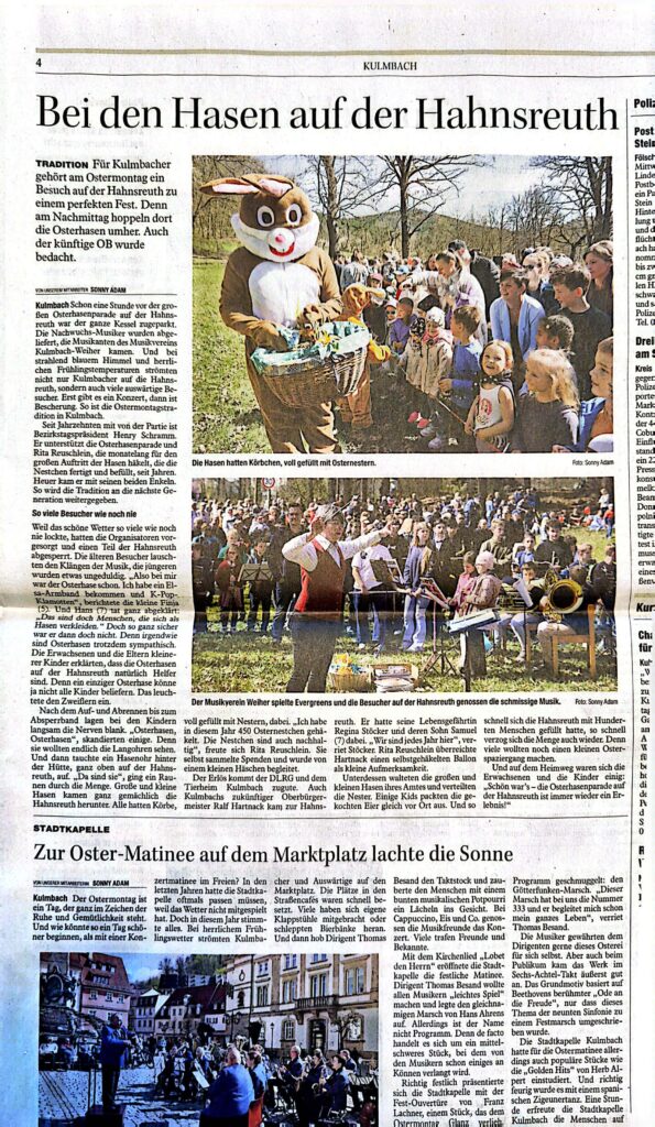 Zum dritten Mal waren wir beim Osterhasenfest in der hahnsreuth dabei (siehe Zeitungsbericht). Dieses Mal waren wir mit rund 50