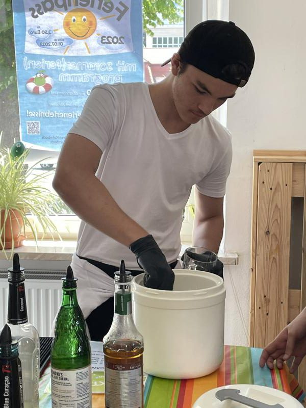 Der Schulsanitätsdienst der Max-Hundt-Schule war zusammen mit unserer Förderlehrerin Ulrike Peschel Ende Juni 2023 zu einer Cocktail-Shaker-Schulung im JUZ Kulmbach. Dort lernten die Kids nicht nur alles über Hygiene und das Anreichen von Cocktails, sondern auch, wie man alkoholfreie Cocktails mixen kann. Alles erst in der Theorie und anschließend im Selbstversuch am Boston-Shaker. Hier mussten man besonders darauf achten, das Glas richtig in den Shaker zu klopfen um es anschließend auch wieder von diesem trennen zu können. Natürlich wurden alle Cocktails selbst gemixt und anschließend auch versucht. Das Ergebnis war einstimmig: Sie sind alle sehr lecker, egal ob Cocconut Kiss oder Ginger. Das nächste Schulfest kann kommen!