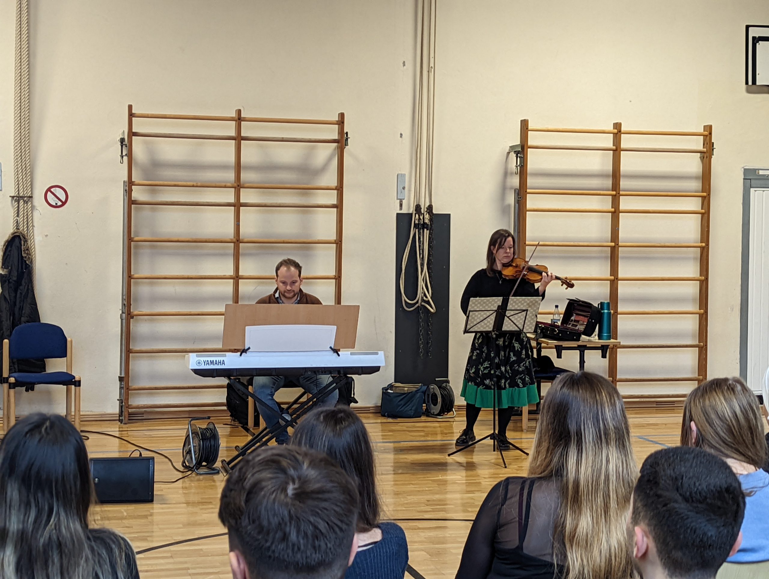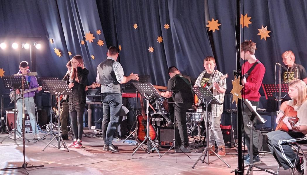 Im Mittelschulkonzert waren erneut die beiden Bläserklassen, die Schülerband und die Lehrerband dabei. Frau Gick führte zudem mit Schülerinnen der 5b ihre Version von „Morgen kommt der Weihanchtsmann“ auf. Eine besondere Einlage boten die Schüler und Schülerinnen der Brückenklasse aus der Ukraine unter der leitung von Frau Ohnyanik. In ihrer Landestracht zeigten sie einen beeindruckenden ukrainischen Tanz und ein ukrainisches Weihnachtslied.