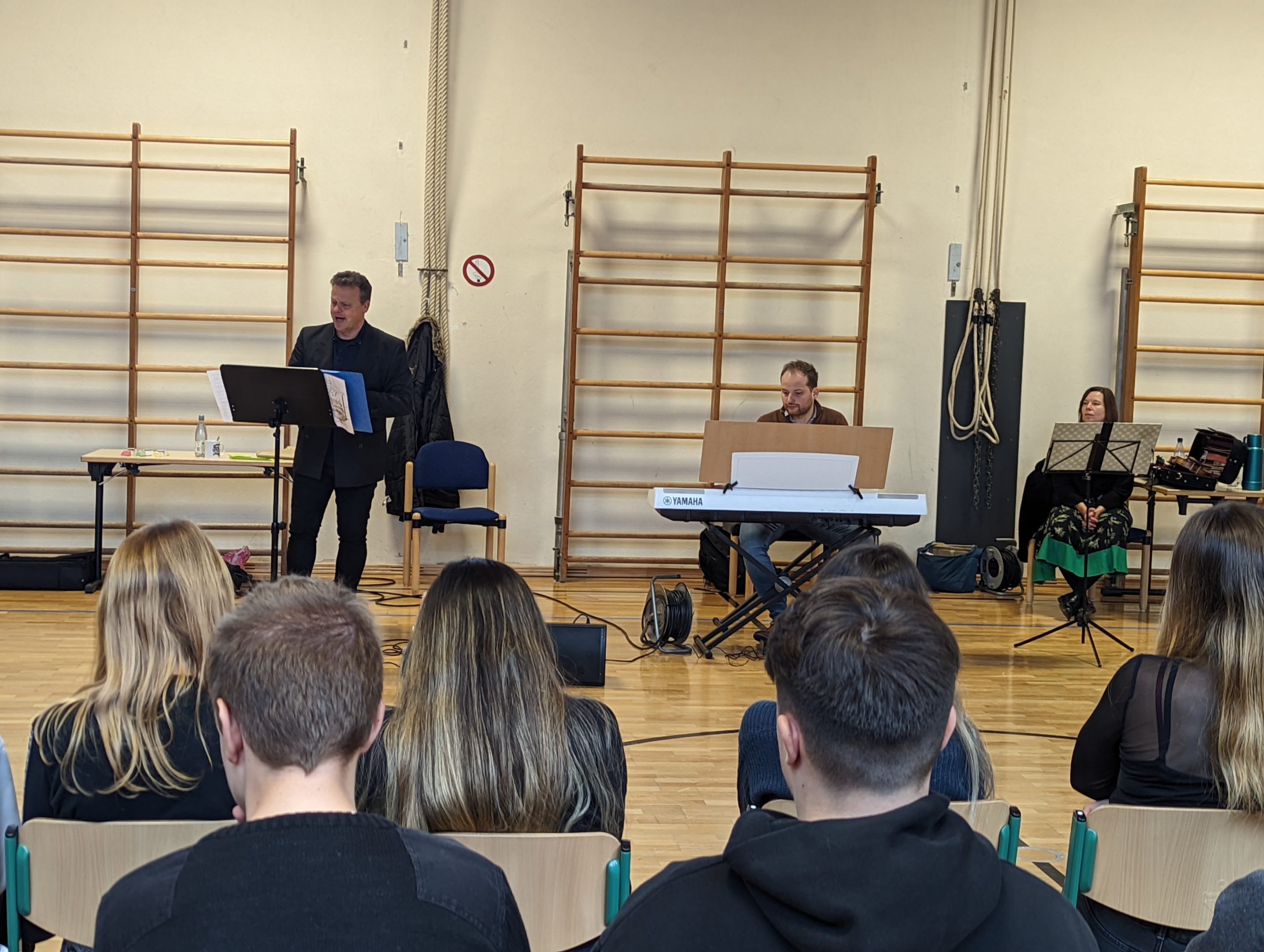 As soon as everyone was seated, Jim started his brilliant program: After a short introduction and a couple of warm-up questions Jim burnt down a firework of interactive and funny stories and stage plays. While students and teachers acted out the stories, Jim was the director and narrator. The 45 minutes of intense surprise, laughter and suspenseful narration went over in the blink of an eye. It was with a heavy heart that the first group of students and teachers said goodbye and went on their journey back to the classroom. Now it was the other classes’ turn.